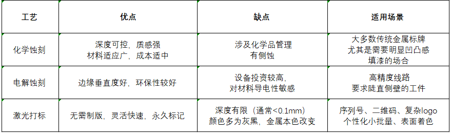 特點:適用材料廣(不銹鋼、銅、鋁、黃銅等),可進行復雜圖形和批量生產,深度可控,是最常用的標牌蝕刻方法。